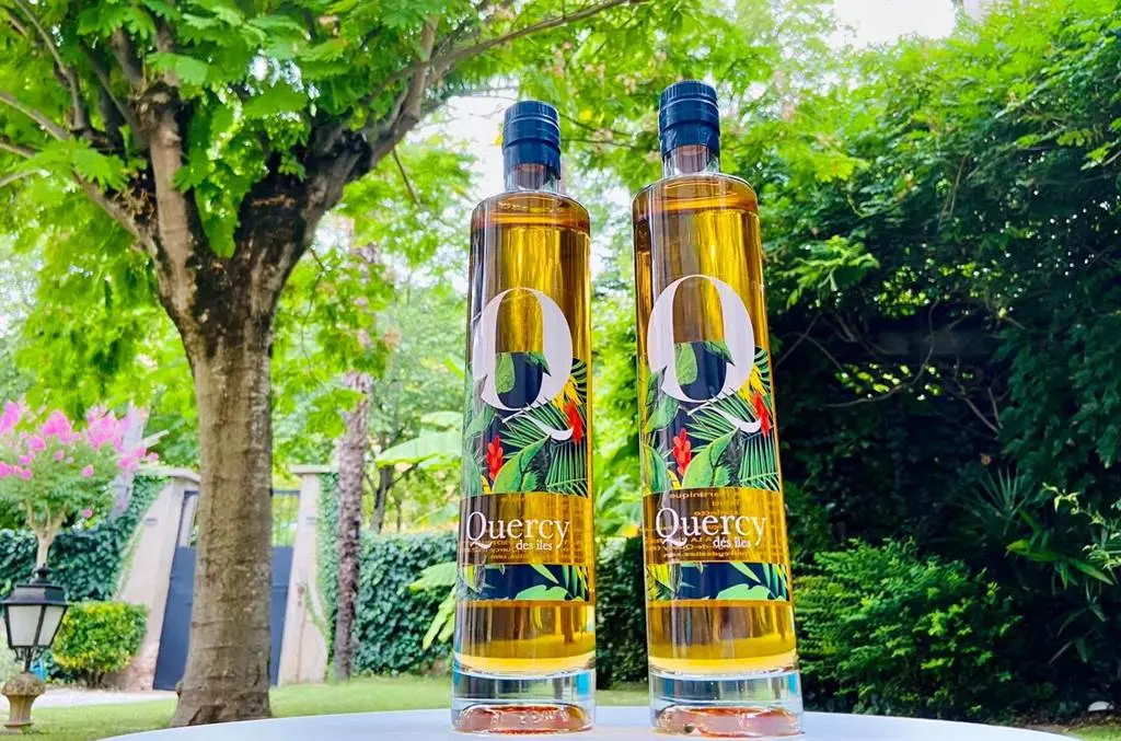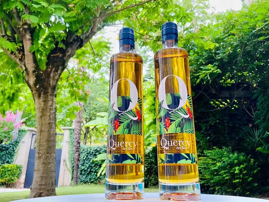 Créé sur les coteaux de Moissac, Quercy des îles est un assemblage de rhum AOP de la Martinique, jus de Chasselas de Moissac, vanille de Tahiti, piment d'Espelette AOP.