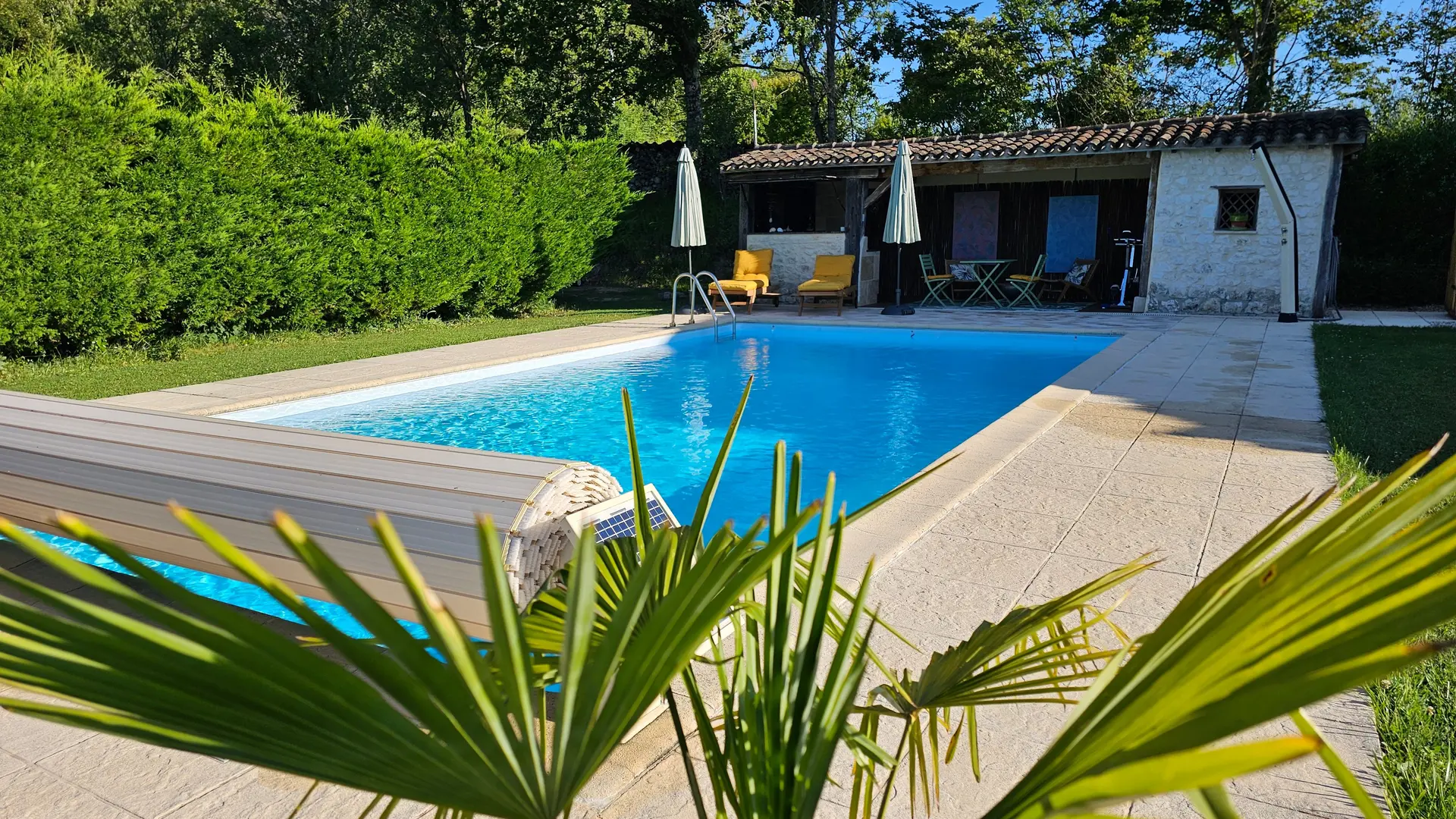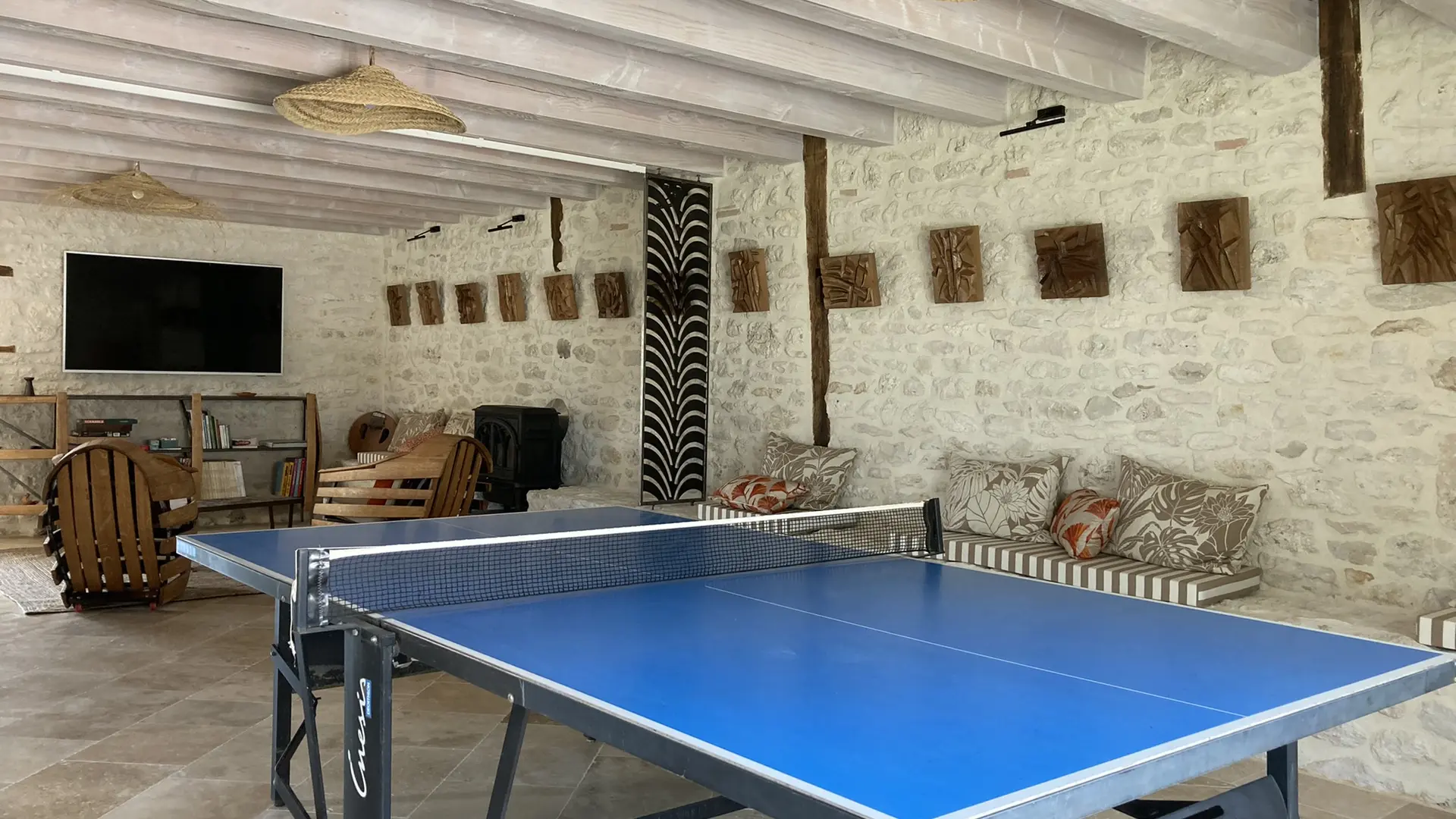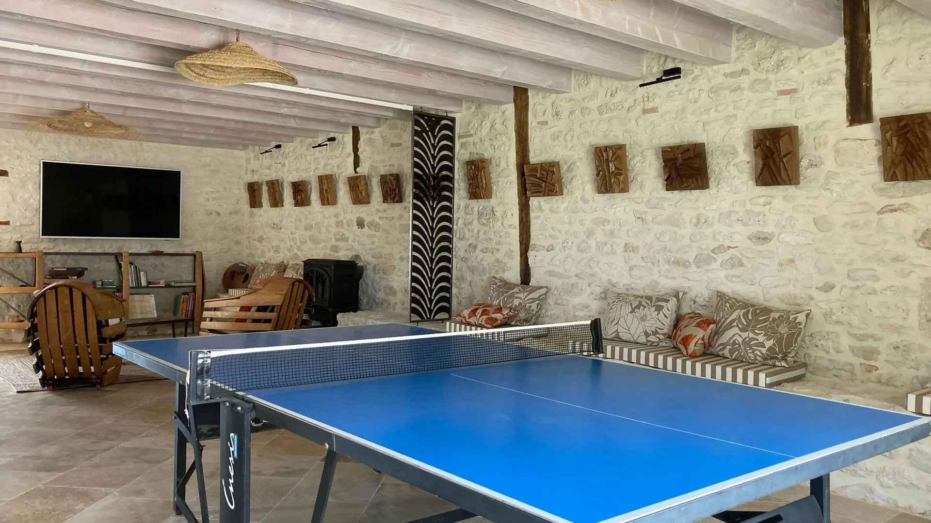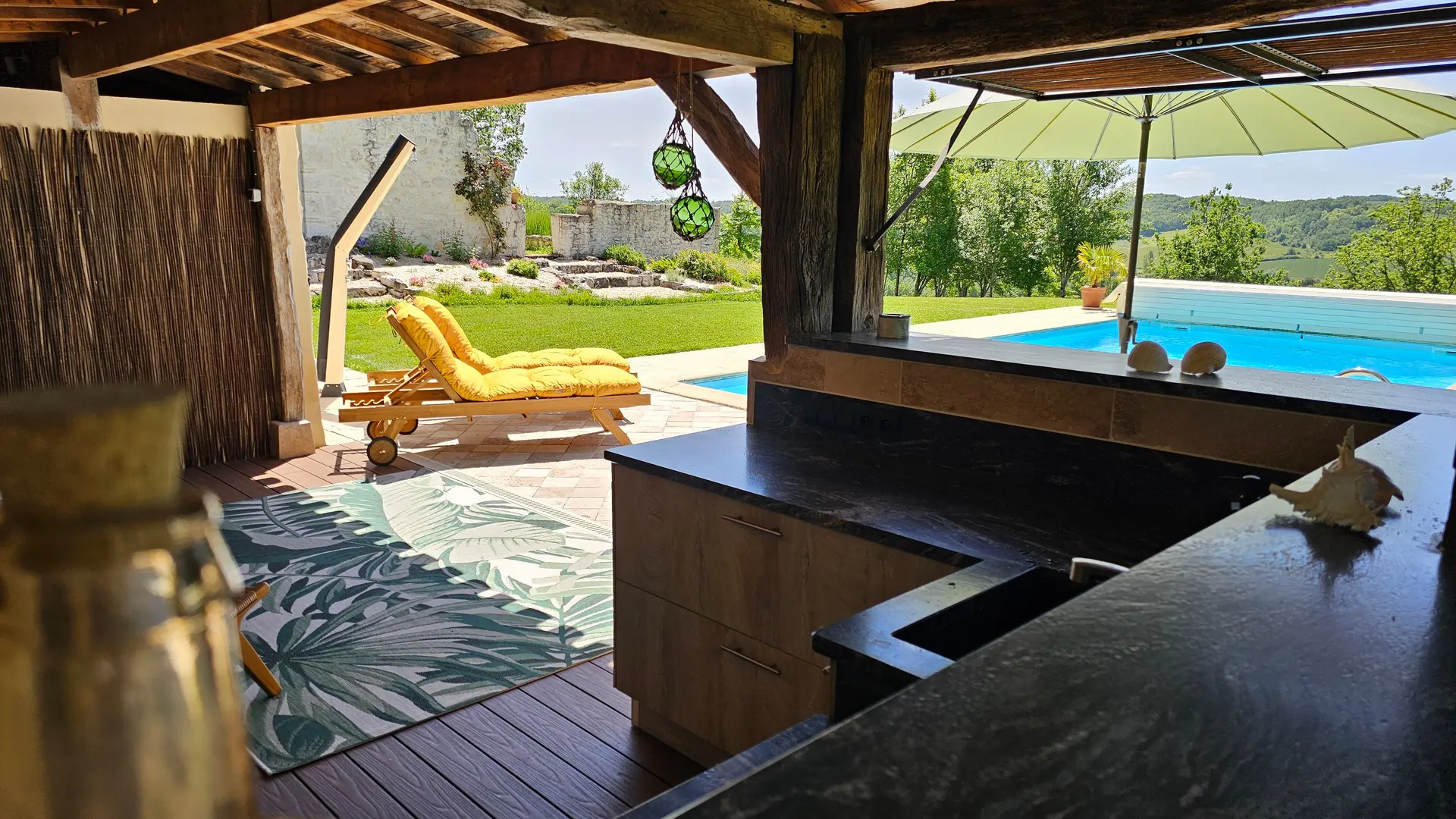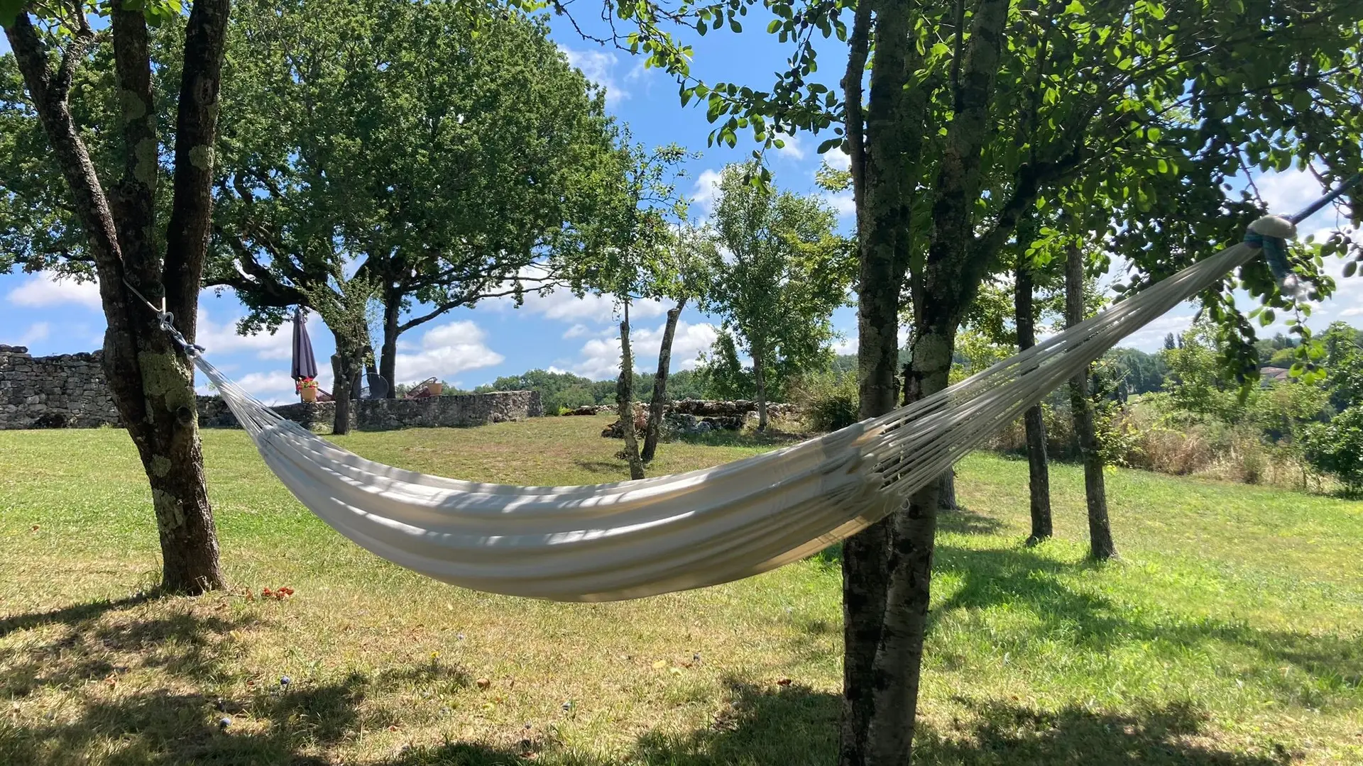 Tout un ensemble fait de plusieurs bâtiments composent ce lieu magique : dans le premier bâtiment, une cuisine intégrée (lave-vaisselle, lave-linge, micro-ondes, four, plaque, hotte, réfrigérateur), table haute avec tabourets, une chambre (lit King size pouvant être séparé en lits jumeaux, tables de nuits, fauteuils, table basse, armoire), une salle d'eau avec wc et une terrasse avec table et chaises. Dans la grange annexe, un salon avec fauteuils, TV, jeux de société, table de ping-pong, vélo d'appartement, livres... le tout exclusivement réservé et privatif aux hôtes. De cette grange accès direct à la piscine avec sa cuisine d'été complète exclusivement réservée aux hôtes, aquabike et toilettes sèches. Wifi dans tout le logement y compris dans la grange, près de la piscine et sur les terrasses. Piscine (10X5 avec fosse à plonger 2,50m), bains de soleil, parasols, aquabike. Linge de lit, de toilette, de maison, foutas pour la piscine mis à disposition et inclus. Un adoucisseur d'eau alimente le gîte, la cuisine d'été et la douche solaire. Terrasse panoramique avec point de vue sur le golf des Roucous de Sauveterre (mobilier de jardin). Equipement pour bébé sur demande (lit parapluie, linge de lit, chaise haute, vaisselle adaptée, baignoire). Sur place borne de recharge électrique pour véhicule électrique ou hybride.