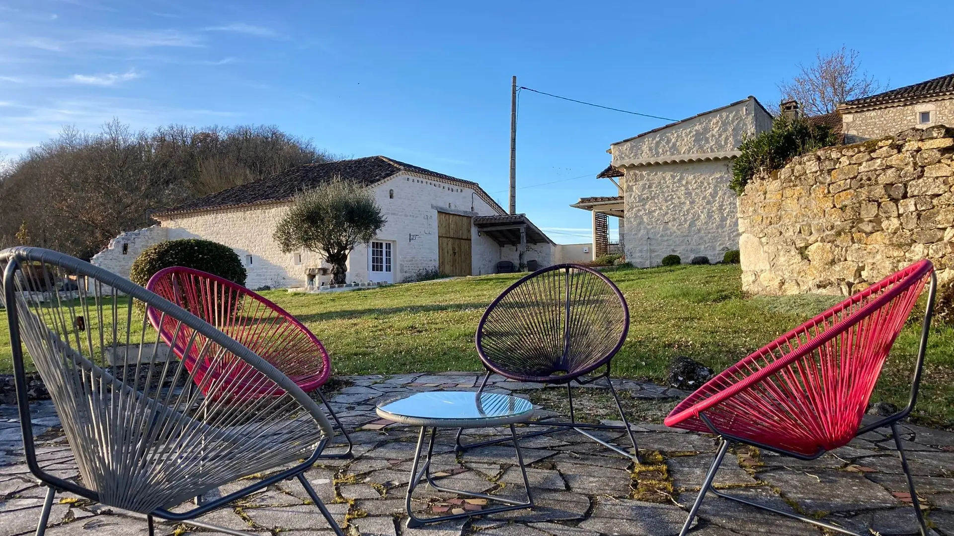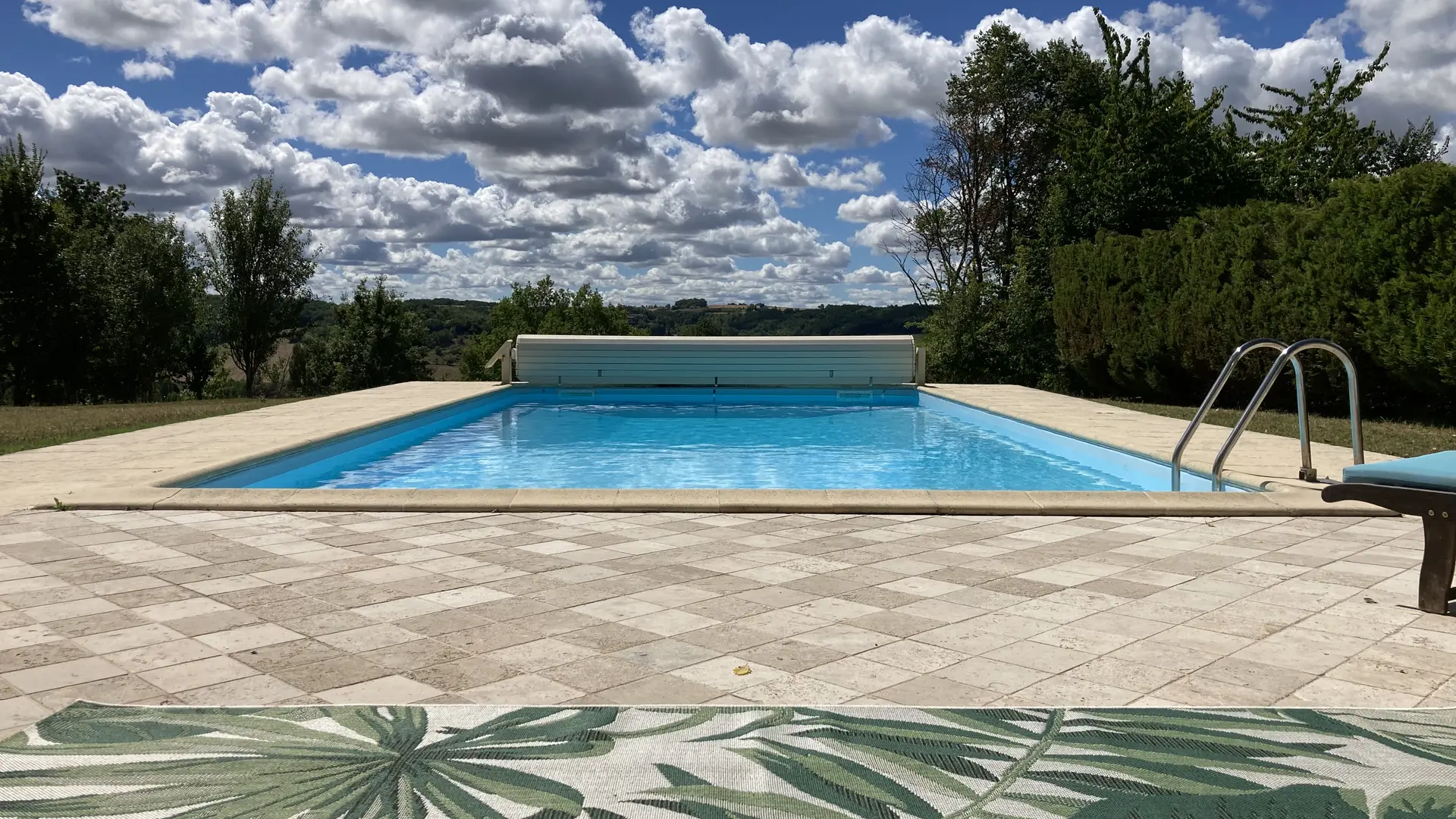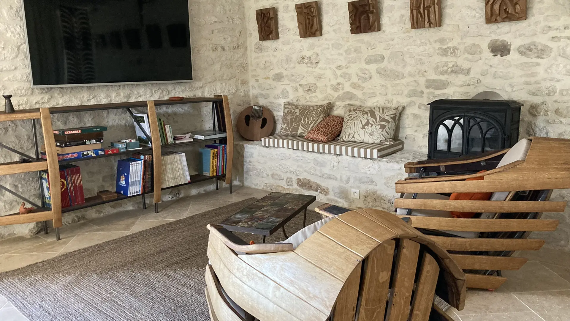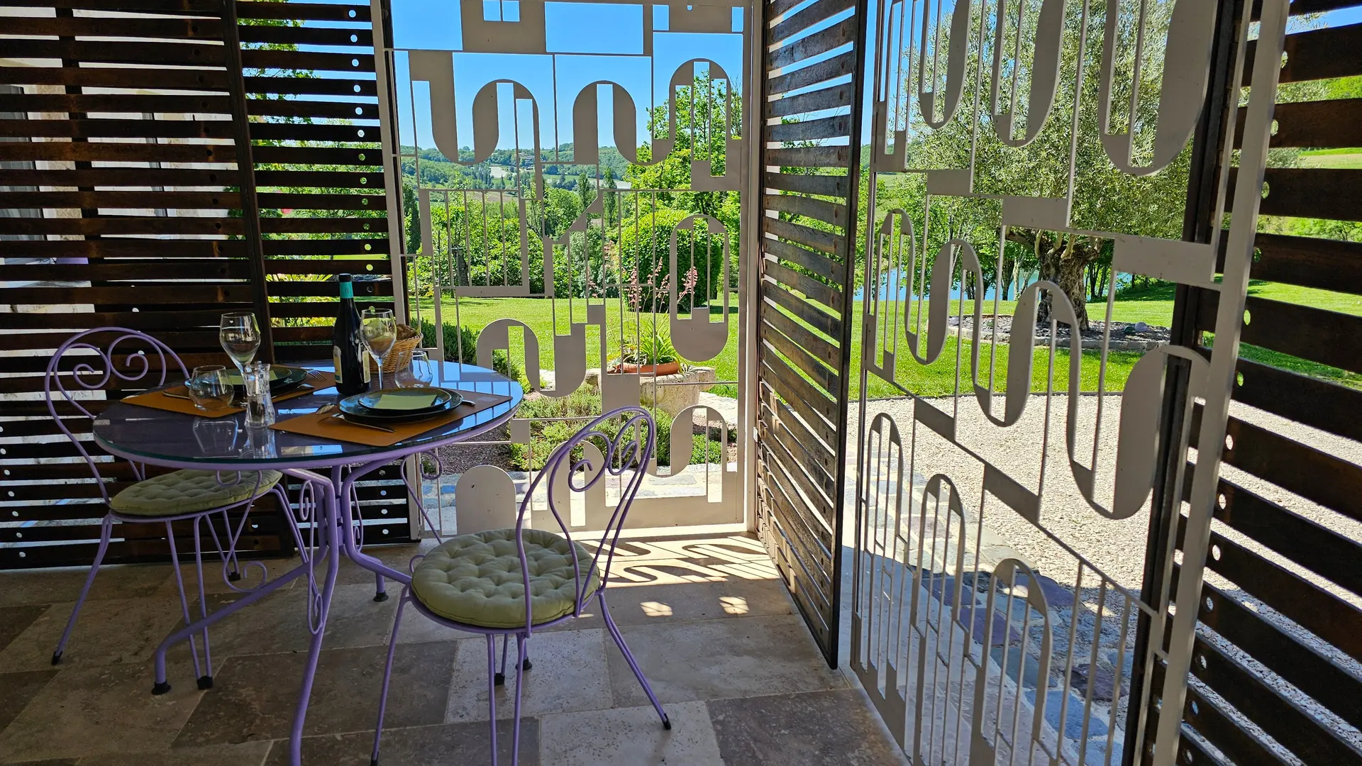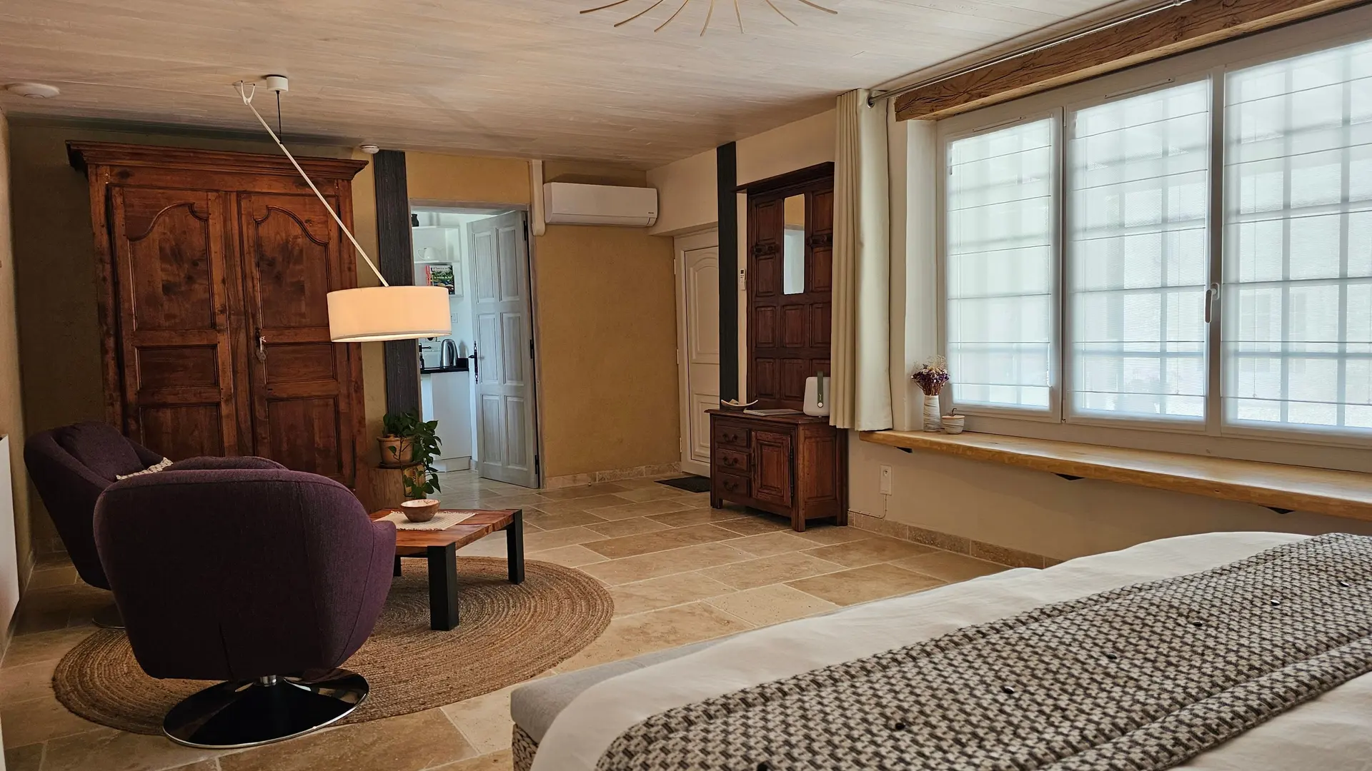 Tout un ensemble fait de plusieurs bâtiments composent ce lieu magique : dans le premier bâtiment, une cuisine intégrée (lave-vaisselle, lave-linge, micro-ondes, four, plaque, hotte, réfrigérateur), table haute avec tabourets, une chambre (lit King size pouvant être séparé en lits jumeaux, tables de nuits, fauteuils, table basse, armoire), une salle d'eau avec wc et une terrasse avec table et chaises. Dans la grange annexe, un salon avec fauteuils, TV, jeux de société, table de ping-pong, vélo d'appartement, livres... le tout exclusivement réservé et privatif aux hôtes. De cette grange accès direct à la piscine avec sa cuisine d'été complète exclusivement réservée aux hôtes, aquabike et toilettes sèches. Wifi dans tout le logement y compris dans la grange, près de la piscine et sur les terrasses. Piscine (10X5 avec fosse à plonger 2,50m), bains de soleil, parasols, aquabike. Linge de lit, de toilette, de maison, foutas pour la piscine mis à disposition et inclus. Un adoucisseur d'eau alimente le gîte, la cuisine d'été et la douche solaire. Terrasse panoramique avec point de vue sur le golf des Roucous de Sauveterre (mobilier de jardin). Equipement pour bébé sur demande (lit parapluie, linge de lit, chaise haute, vaisselle adaptée, baignoire). Sur place borne de recharge électrique pour véhicule électrique ou hybride.