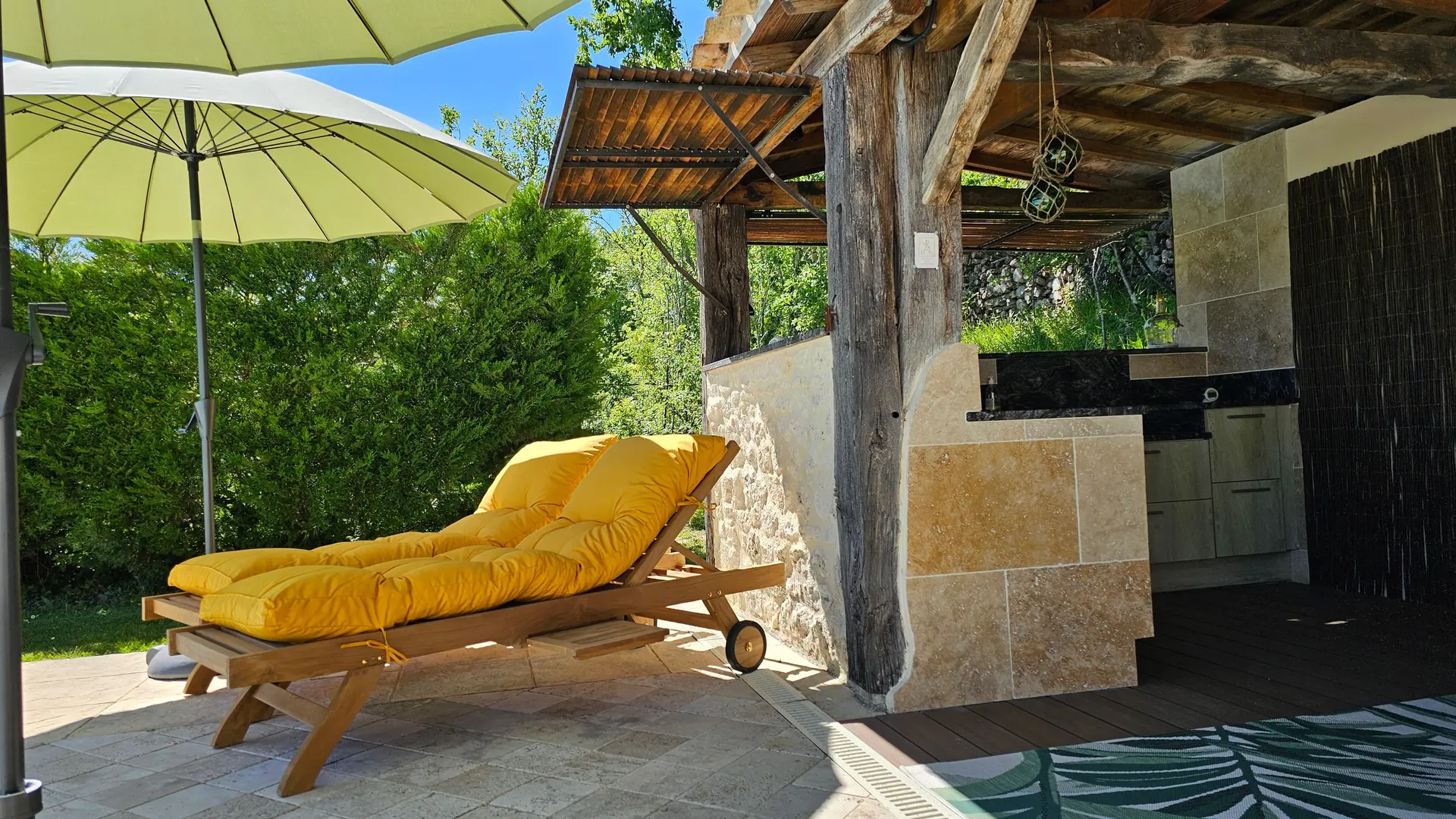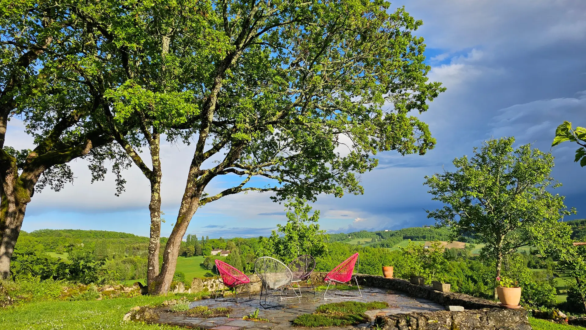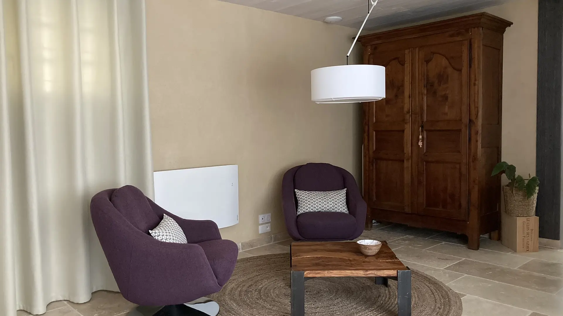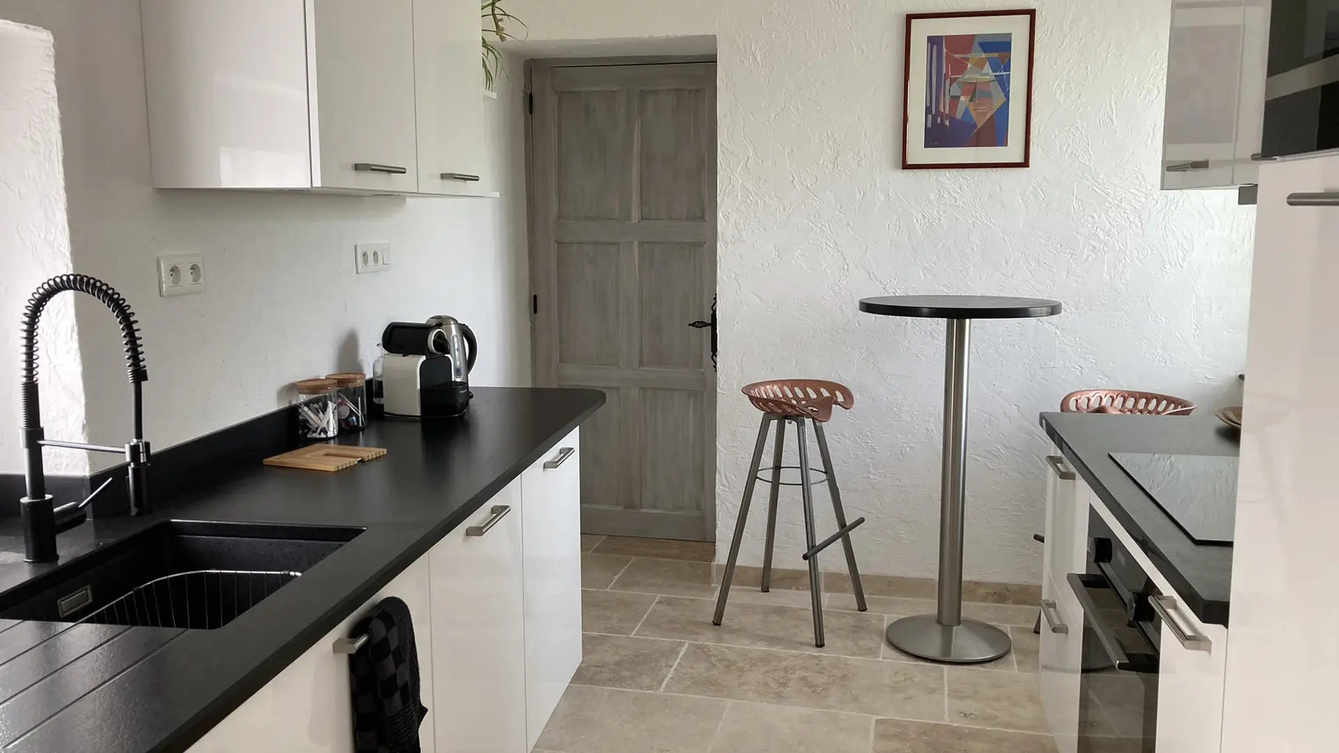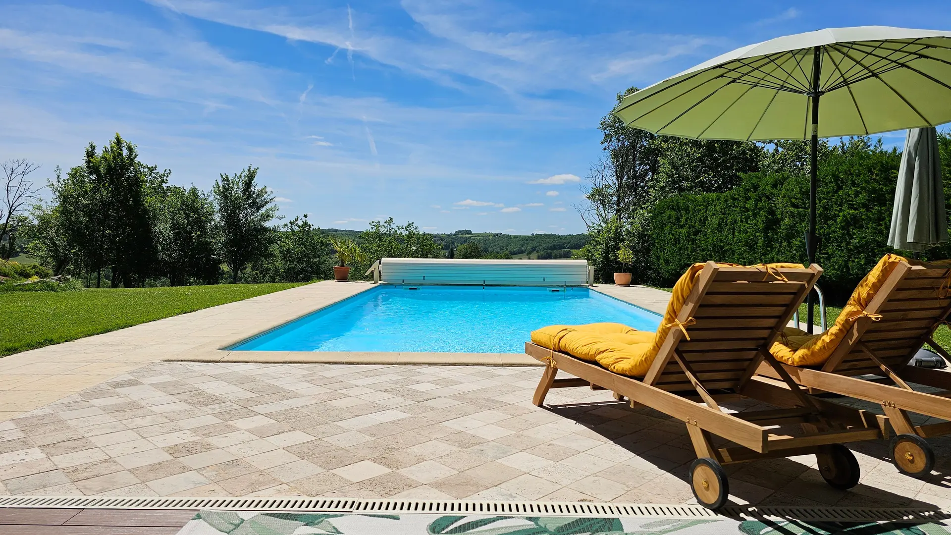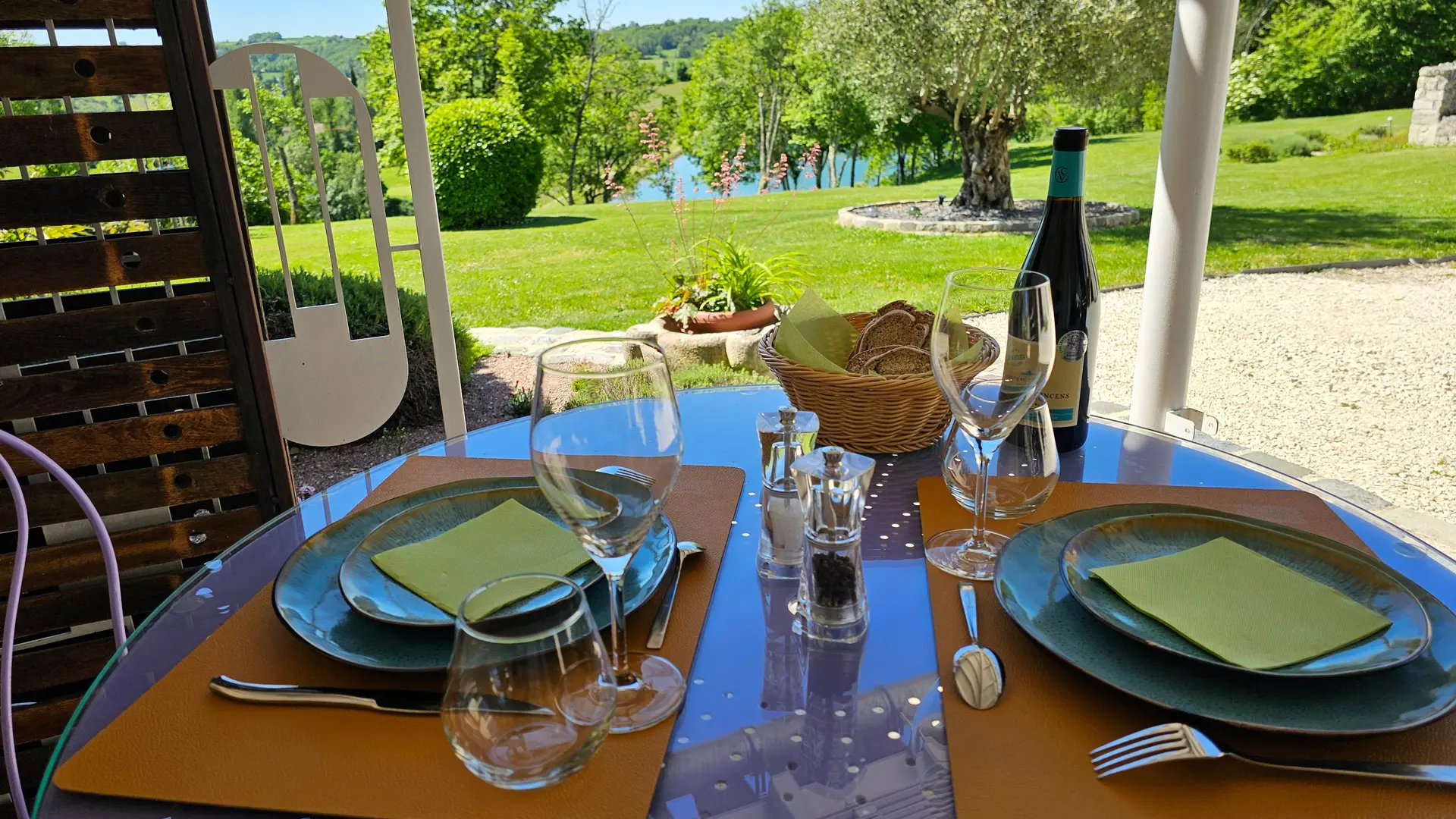 Tout un ensemble fait de plusieurs bâtiments composent ce lieu magique : dans le premier bâtiment, une cuisine intégrée (lave-vaisselle, lave-linge, micro-ondes, four, plaque, hotte, réfrigérateur), table haute avec tabourets, une chambre (lit King size pouvant être séparé en lits jumeaux, tables de nuits, fauteuils, table basse, armoire), une salle d'eau avec wc et une terrasse avec table et chaises. Dans la grange annexe, un salon avec fauteuils, TV, jeux de société, table de ping-pong, vélo d'appartement, livres... le tout exclusivement réservé et privatif aux hôtes. De cette grange accès direct à la piscine avec sa cuisine d'été complète exclusivement réservée aux hôtes, aquabike et toilettes sèches. Wifi dans tout le logement y compris dans la grange, près de la piscine et sur les terrasses. Piscine (10X5 avec fosse à plonger 2,50m), bains de soleil, parasols, aquabike. Linge de lit, de toilette, de maison, foutas pour la piscine mis à disposition et inclus. Un adoucisseur d'eau alimente le gîte, la cuisine d'été et la douche solaire. Terrasse panoramique avec point de vue sur le golf des Roucous de Sauveterre (mobilier de jardin). Equipement pour bébé sur demande (lit parapluie, linge de lit, chaise haute, vaisselle adaptée, baignoire). Sur place borne de recharge électrique pour véhicule électrique ou hybride.