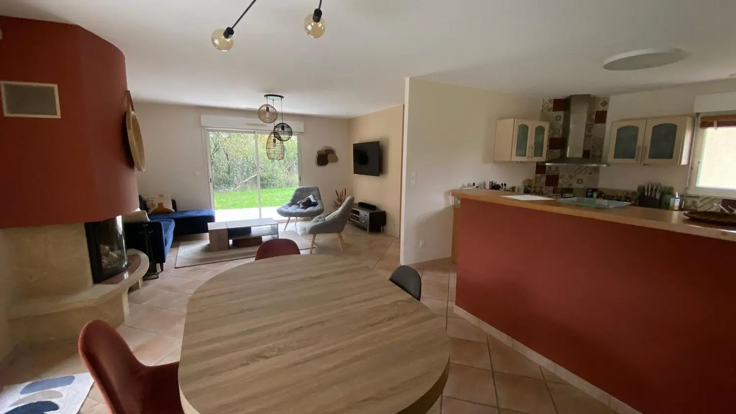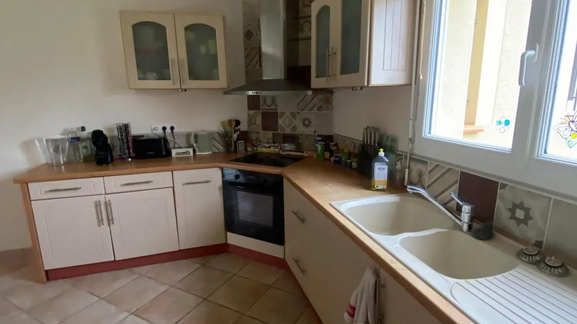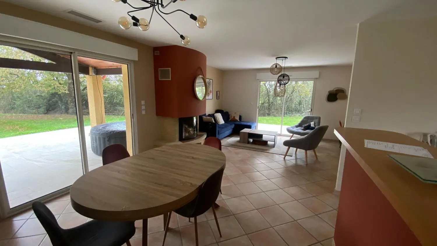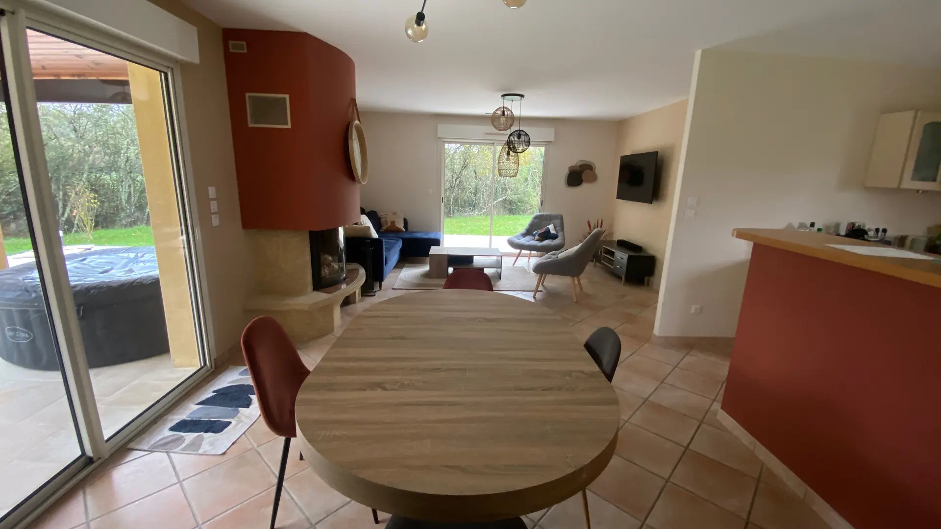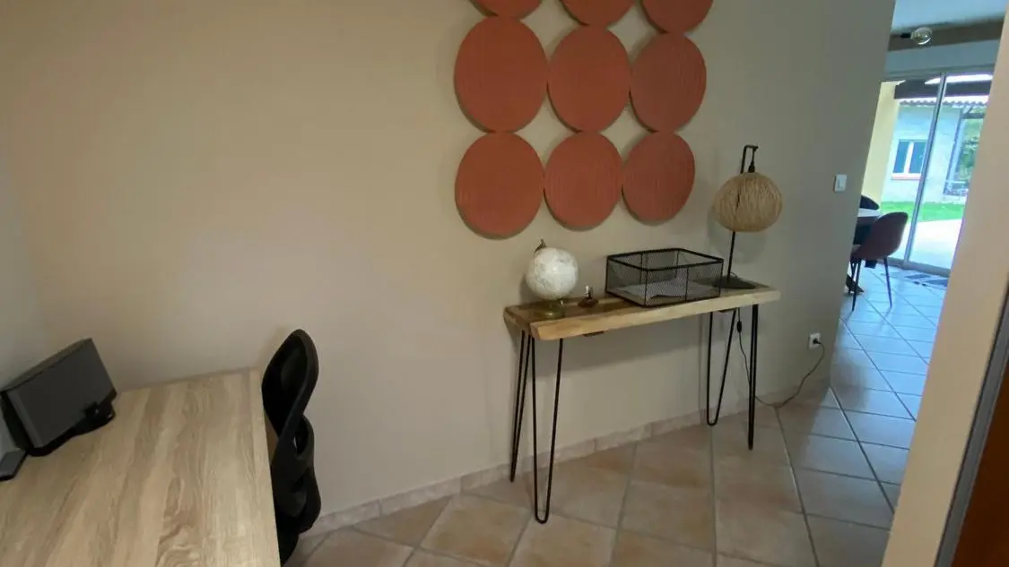 Après une grande terrasse en partie couverte, découvrez la pièce à vivre avec son salon (canapé d'angle, 2 fauteuils, cheminée insert), télévision au mur, l'espace salle à manger (table chaises) donnant sur une cuisine intégrée (lave-vaisselle, réfrigérateur, plaque, micro-ondes), buanderie fermée (sèche-linge, lave-linge, évier, congélateur). Un couloir dessert 3 chambres dont 1 chambre avec 1 lit 160, 1 chambre avec un lit 140 et 1 chambre avec 1 lit 120. Une salle de bains (baignoire et douche, sèche serviette, un wc indépendant. Terrasse de 65 m2 avec spa 2 personnes et salon de jardin. Terrain non clôturé de 6000 m2. Wifi dans tout le logement, linge de lit et de toilette fourni en option. chauffage/climatisation sur relevé compteur arrivée/départ. Pour clientèle professionnelle, obligation ménage et location draps et renouvellement tous les 15 jours.
