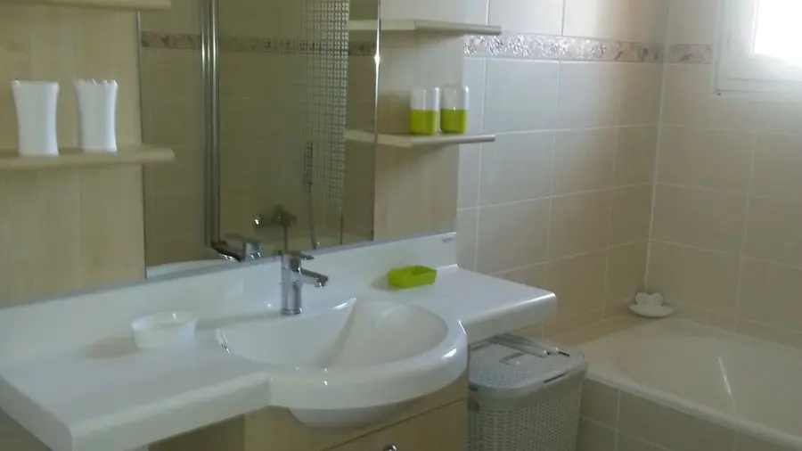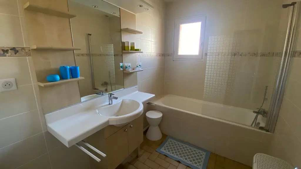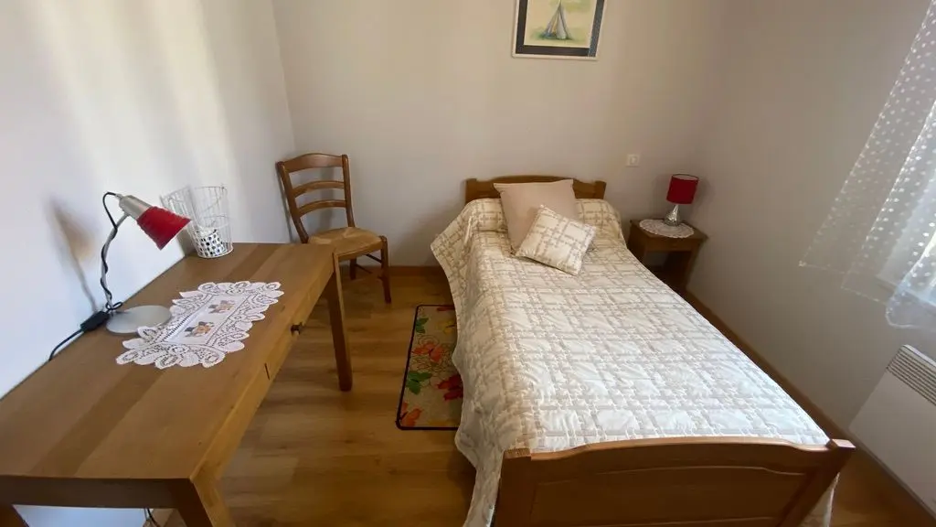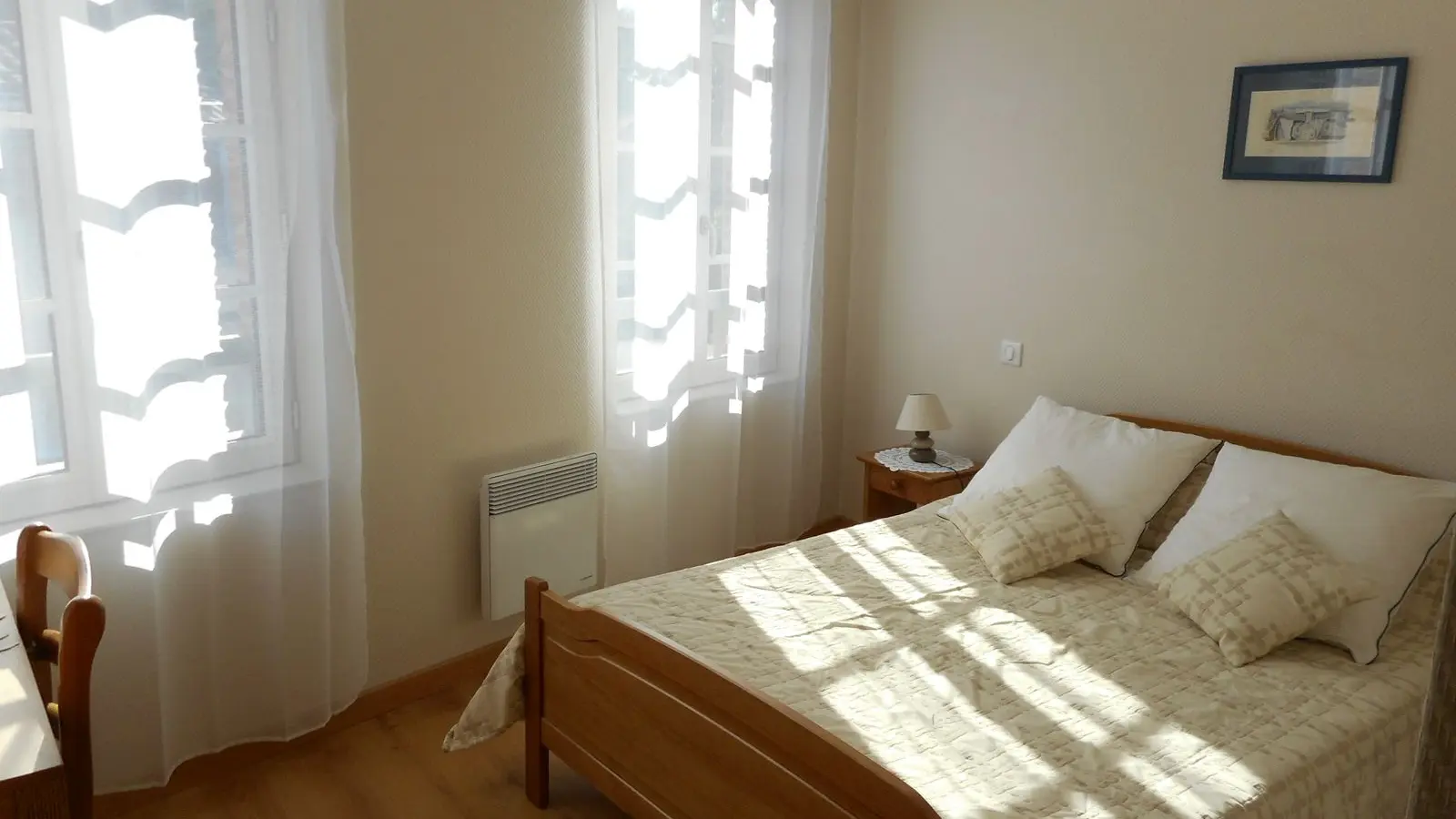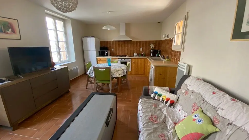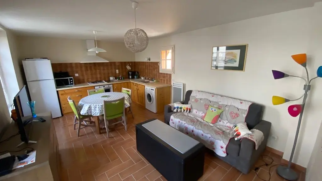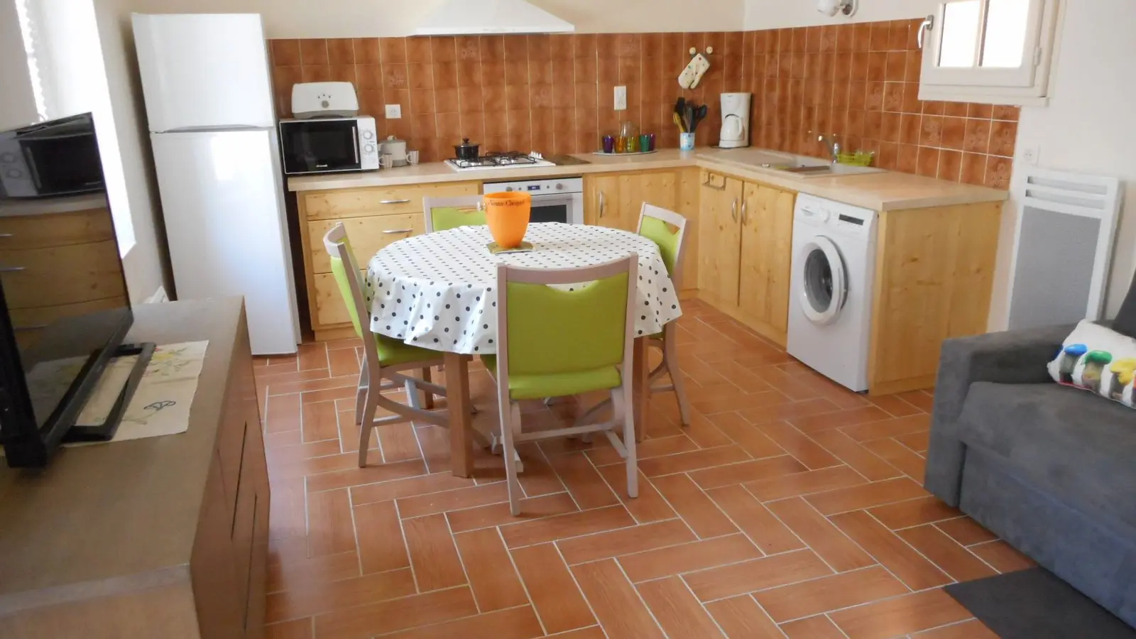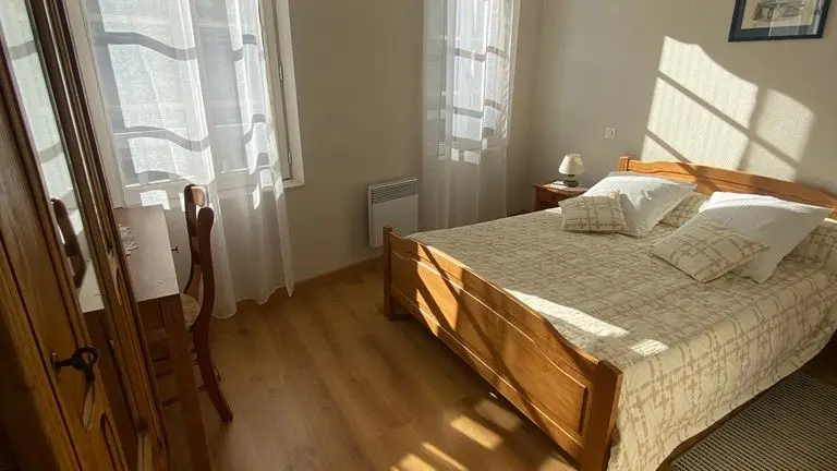 Au rez-de-chaussée : 1 séjour (1 canapé, TV écran plat) avec coin-cuisine (éléments intégrés, MO, LL). Au 1er étage : 1 ch (1 lit 140, 1 bureau), 1 ch (1 lit 90, 1 bureau), 1 salle de bain, 1 WC. Cour, clôturée par des claustras en bois, avec salon de jardin, barbecue. Le logement est équipé de double vitrage. Chauffage électrique. En option : location draps, linge de maison et de toilette, ménage. Connexion internet Wifi gratuit.