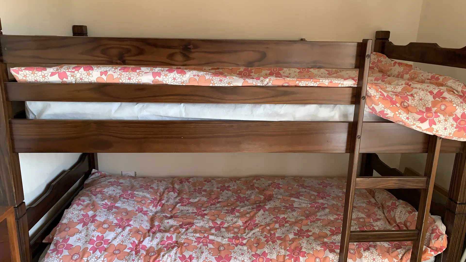 Aménagement simple pour cette maisonnette qui comprend une cuisine équipée, un salon (canapé, télévision), un couloir qui dessert 1 chambre (1 lit 140), 1 chambre (2 lits 90 superposés), 1 salle d'eau (douche, lavabo) avec wc.