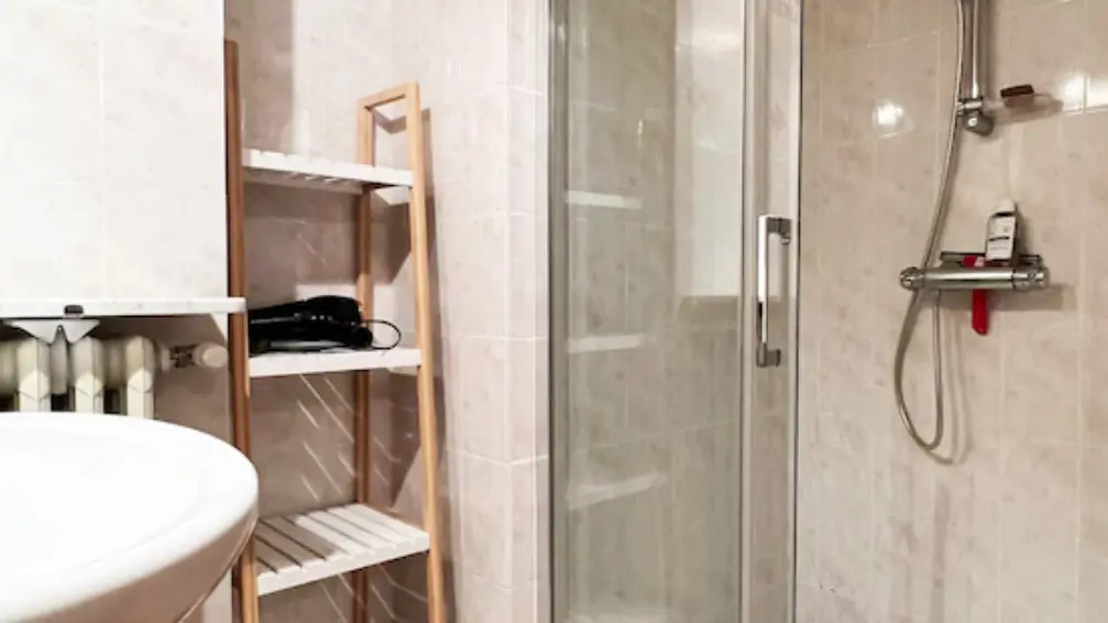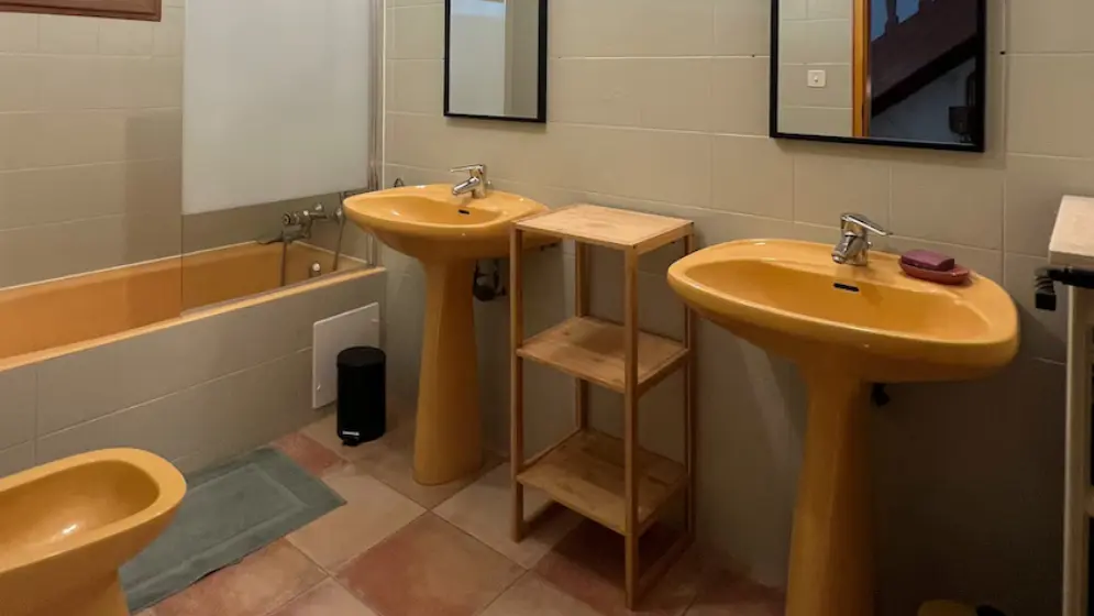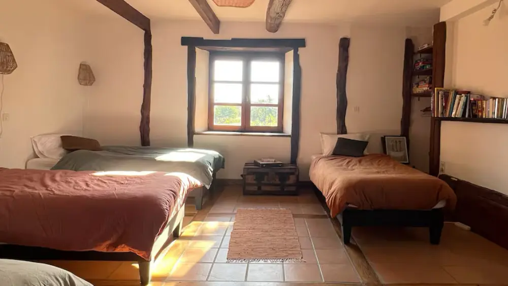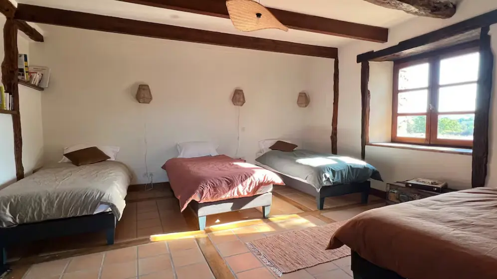À l’étage, quatre chambres accueillent 8 personnes supplémentaires : une chambre avec 4 lits simples et espace enfants avec livres et jeux, une chambre avec deux lits simples, et deux chambres doubles, accompagnées d’une salle de bains.