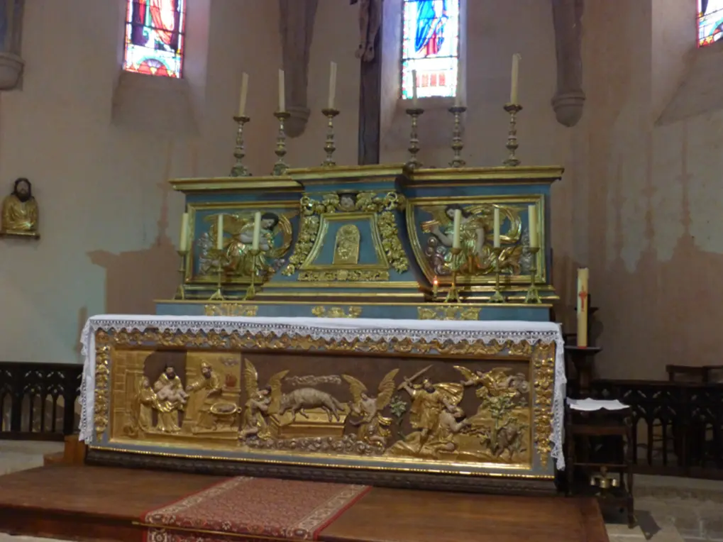 Dans le choeur de l'église se trouve le remarquable autel en bois doré qui est orné de représentations du sacrifice du Christ.
