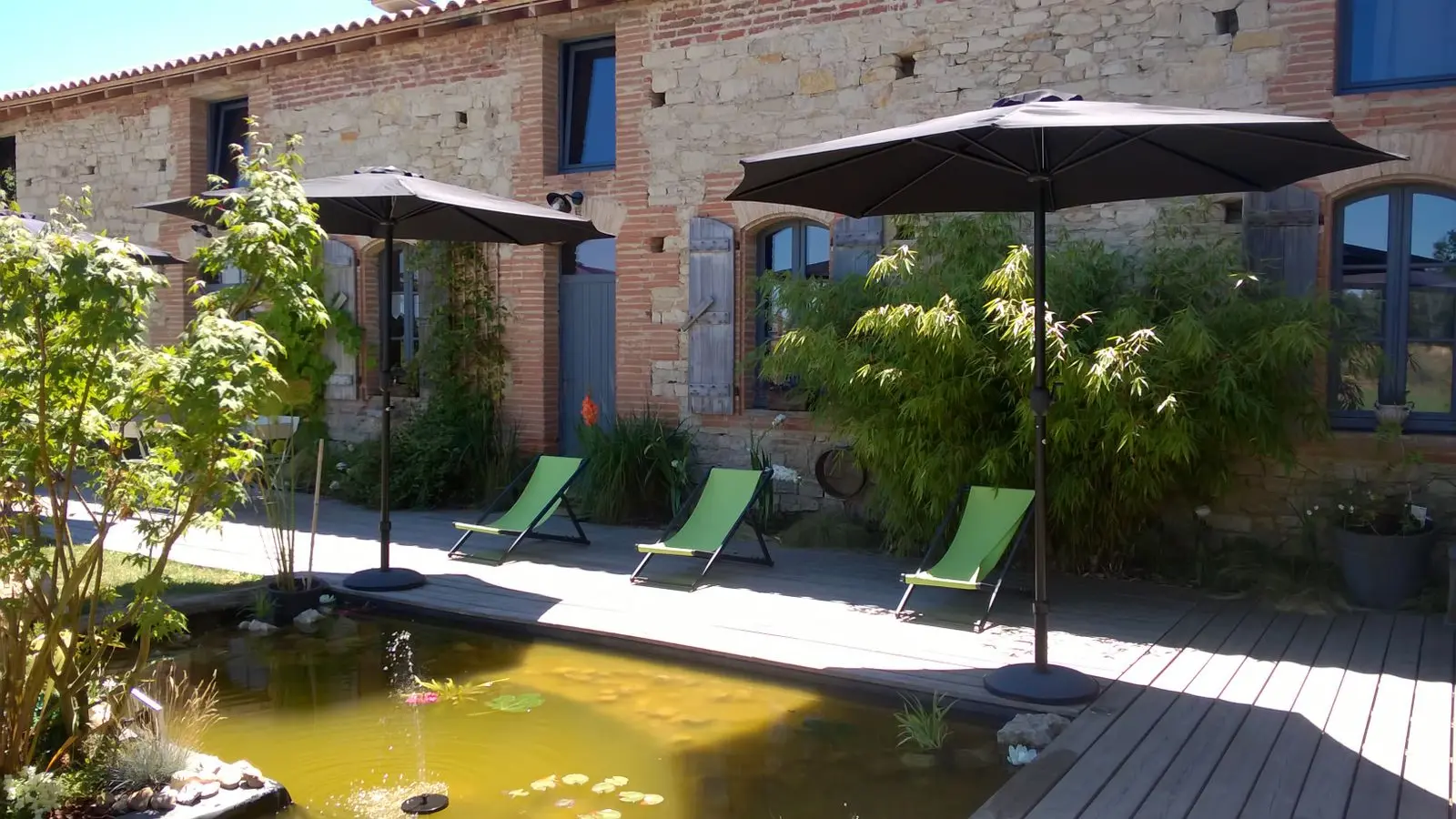 Auprès du bassin décoratif, la grande terrasse vous invite à goûter la fraîcheur du chèvrefeuille, de la glycine pour y vivre de belles heures de partage entre amis.