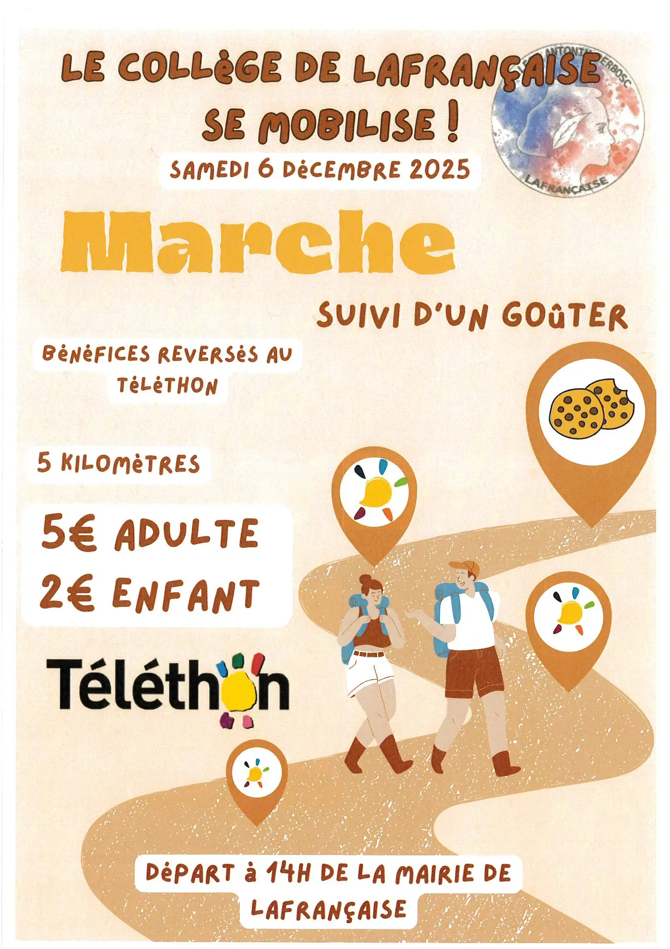 Le collège de Lafrançaise organise une marche solidaire pour soutenir le Téléthon ! Une belle occasion de se mobiliser ensemble pour une cause qui nous tient à cœur.