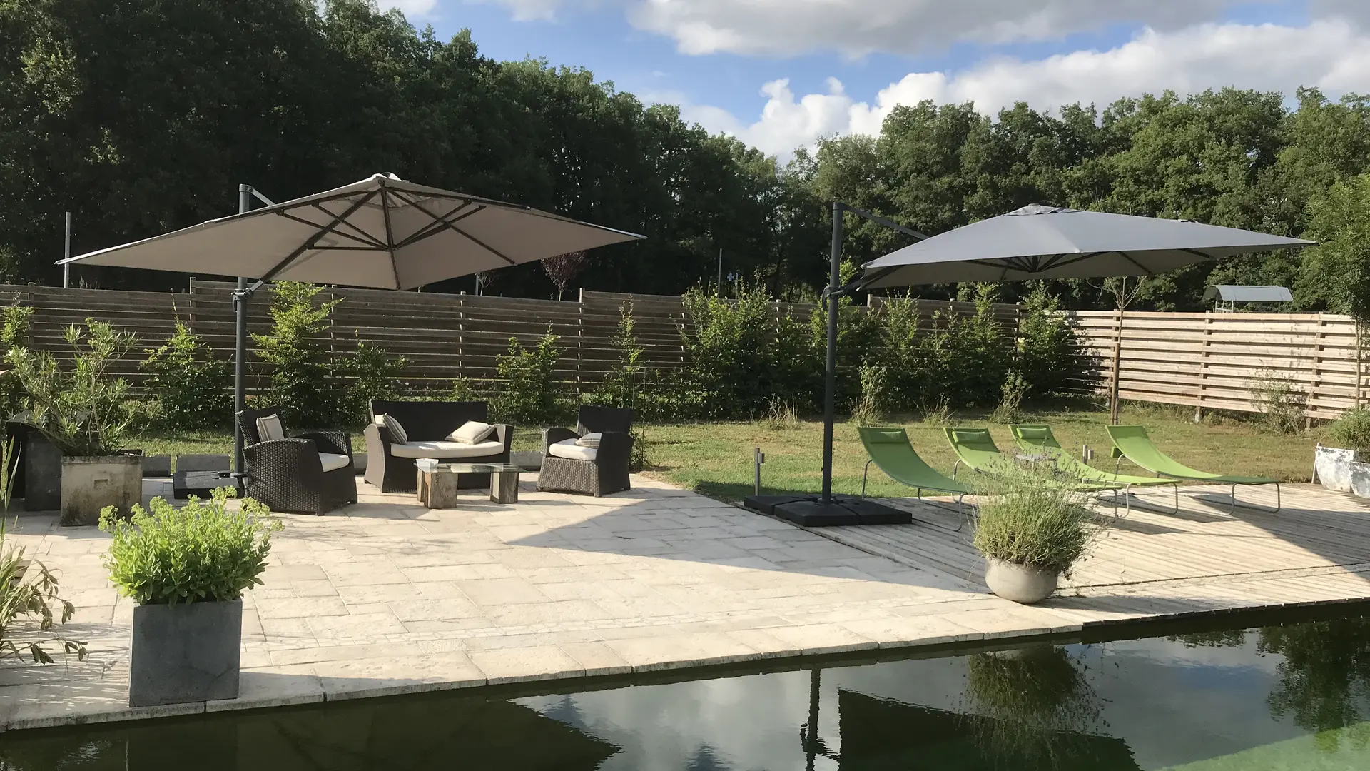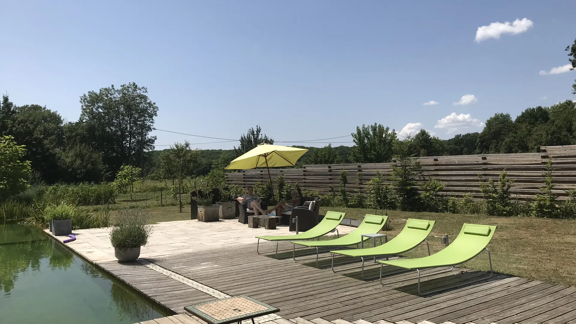 Grande terrasse, chaises longues, barbecue avec vue sur la piscine.