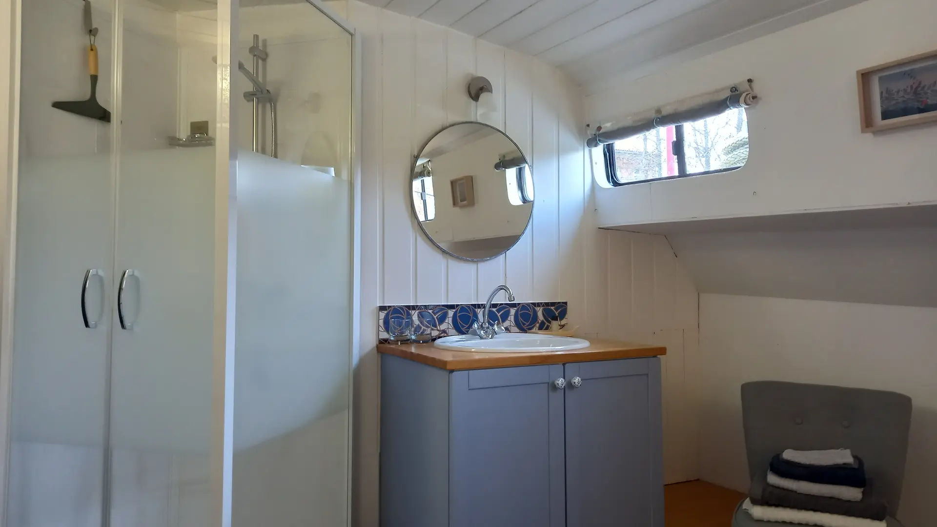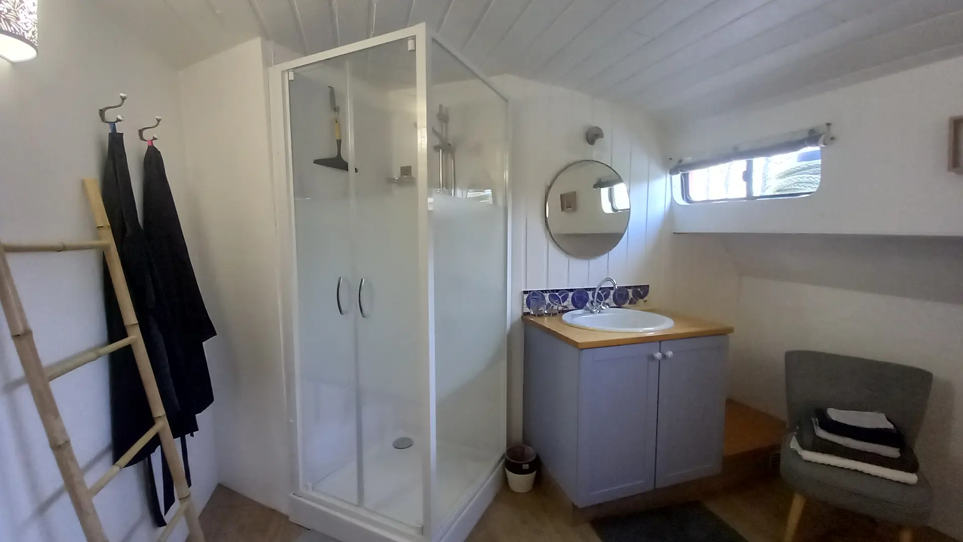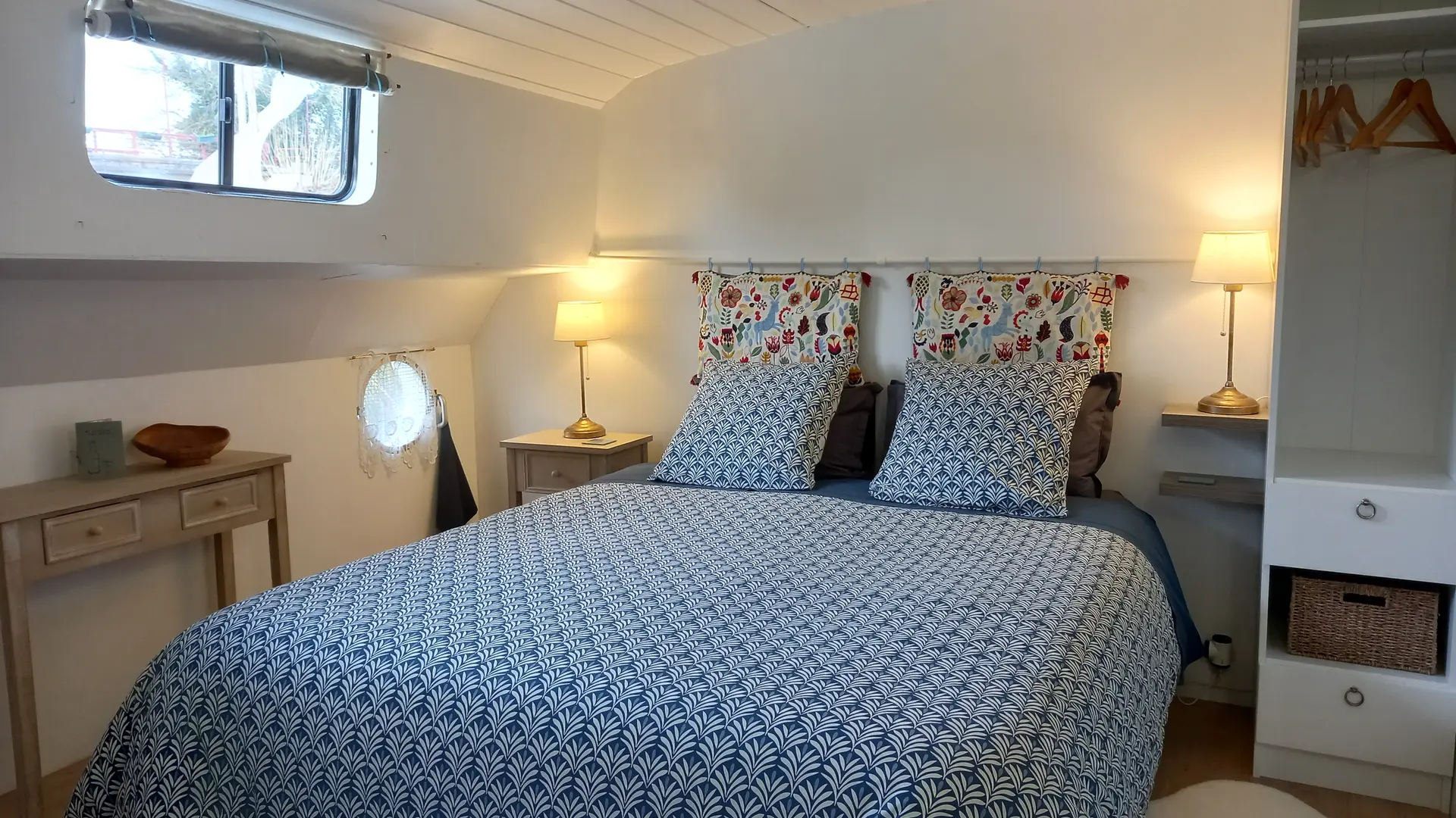 La Cabine Bleue (14 m²) comprenant 1 lit 160x200 modulable en 2 lits 80x200, une penderie, un coffre de rangement, cabine de douche, lavabo et climatisation. WC à l'extérieur de la cabine à l'usage unique des occupants de la cabine Bleue.