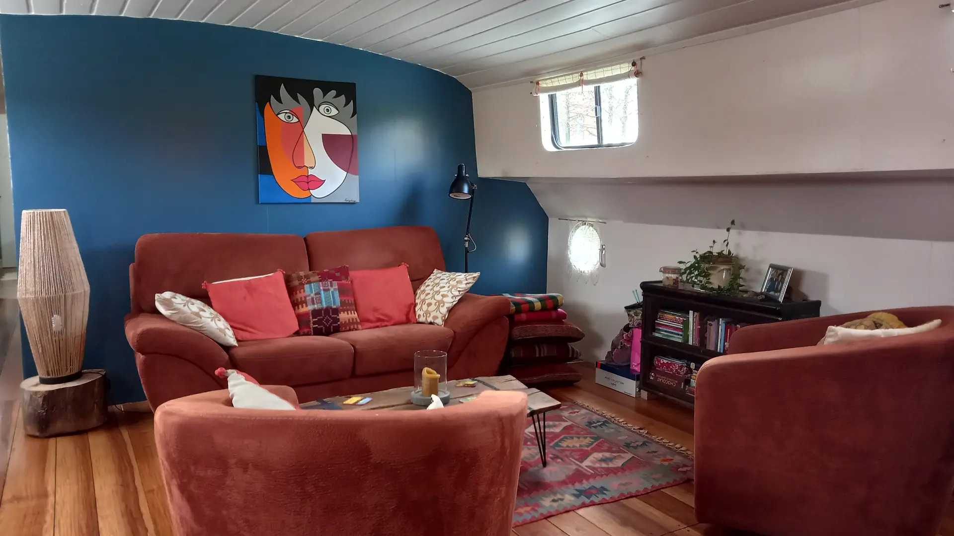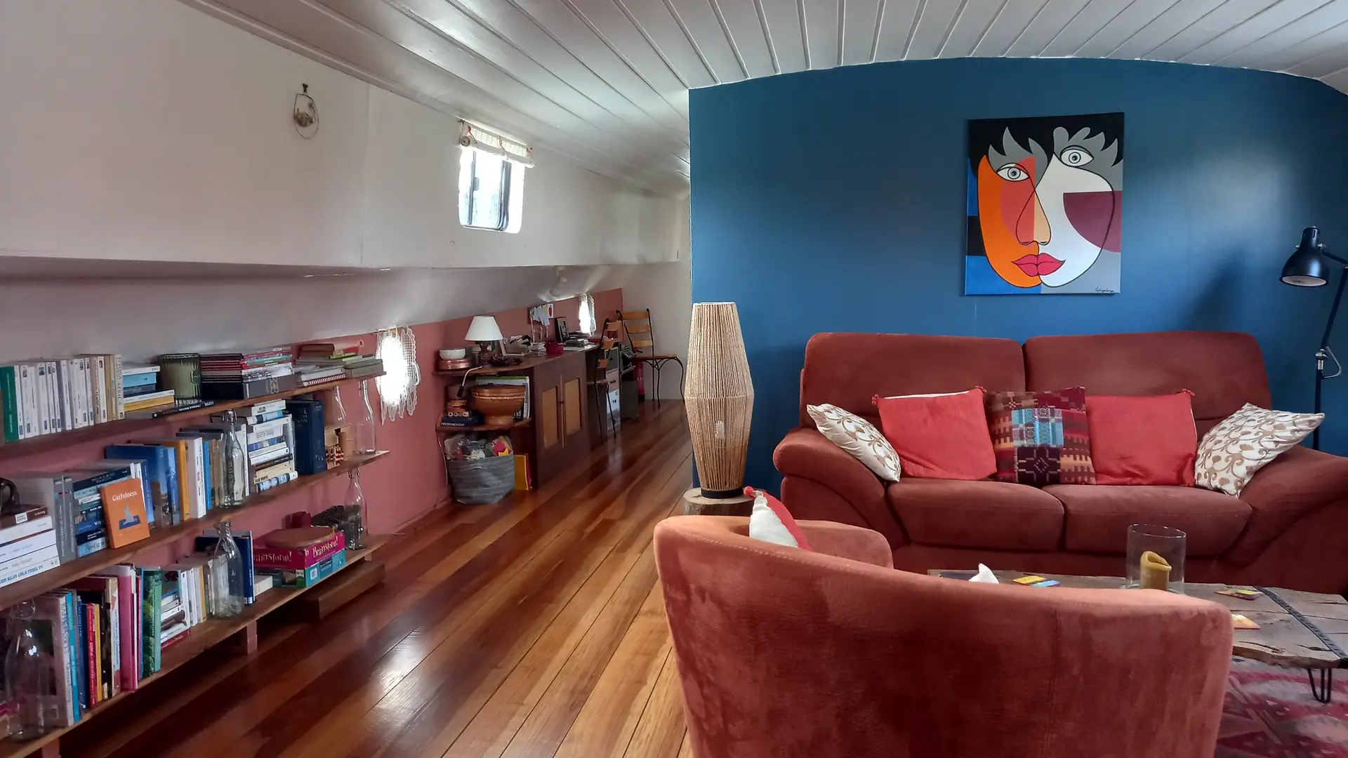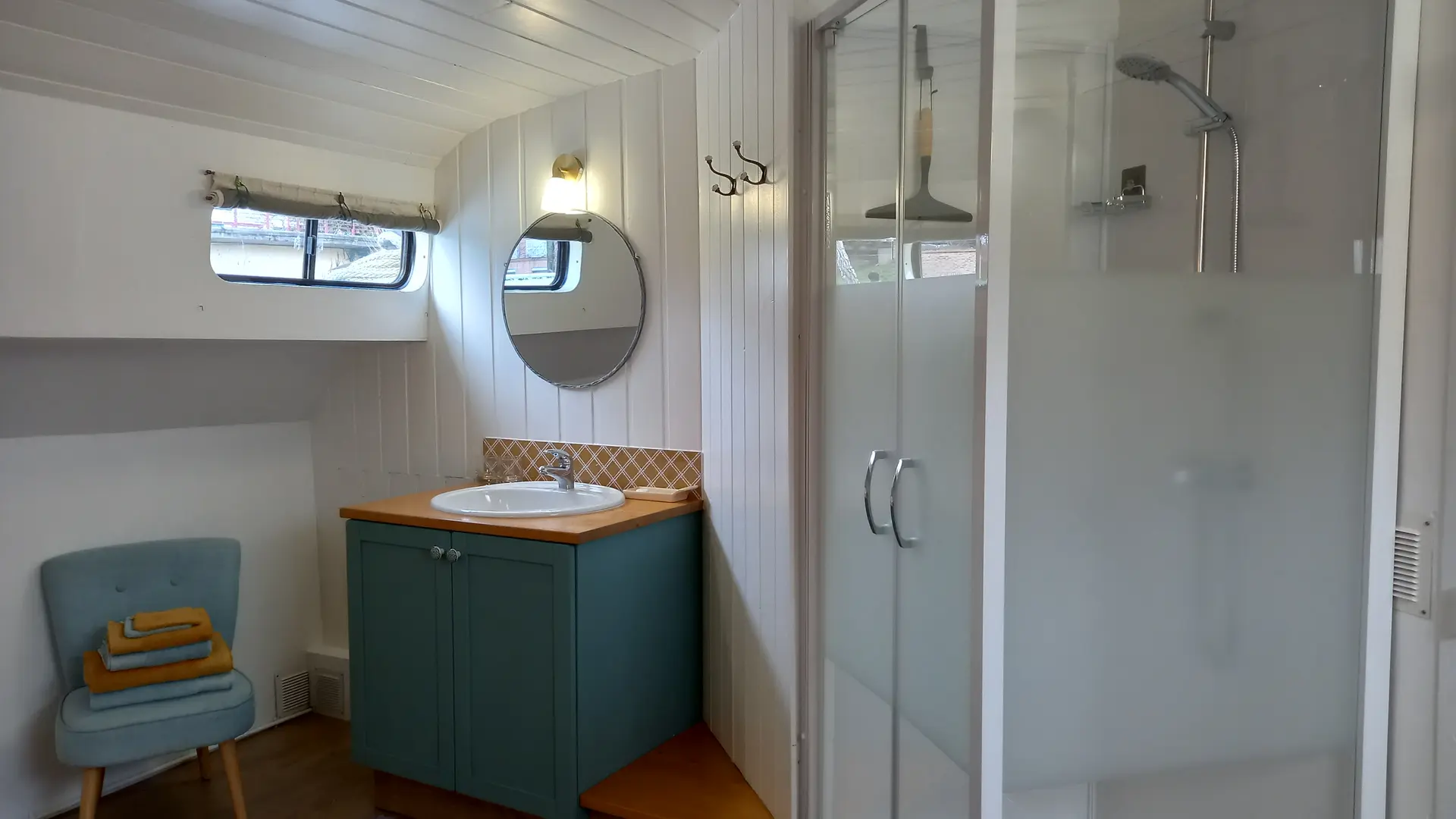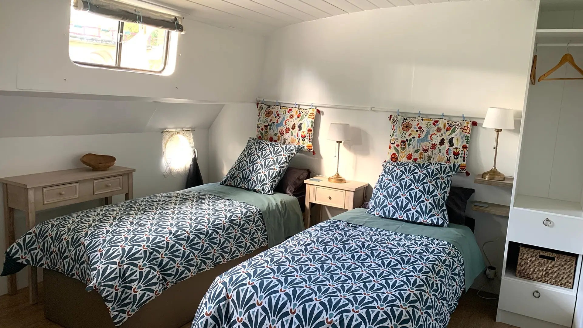 La Cabine Bleue (14 m²) comprenant 1 lit 160x200 modulable en 2 lits 80x200, une penderie, un coffre de rangement, cabine de douche, lavabo et climatisation. WC à l'extérieur de la cabine à l'usage unique des occupants de la cabine Bleue.
