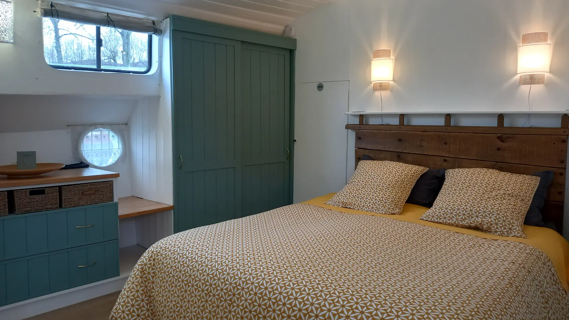 La Cabine Verte (16 m²) comprenant 1 lit 160x200, armoire, coffre de rangement, cabine de douche, lavabo, wc et climatisation.