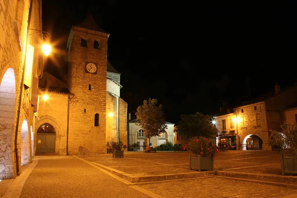 L'église sur l'angle droit de la place des Cornières de Lauzerte, date du XIIIe siècle.