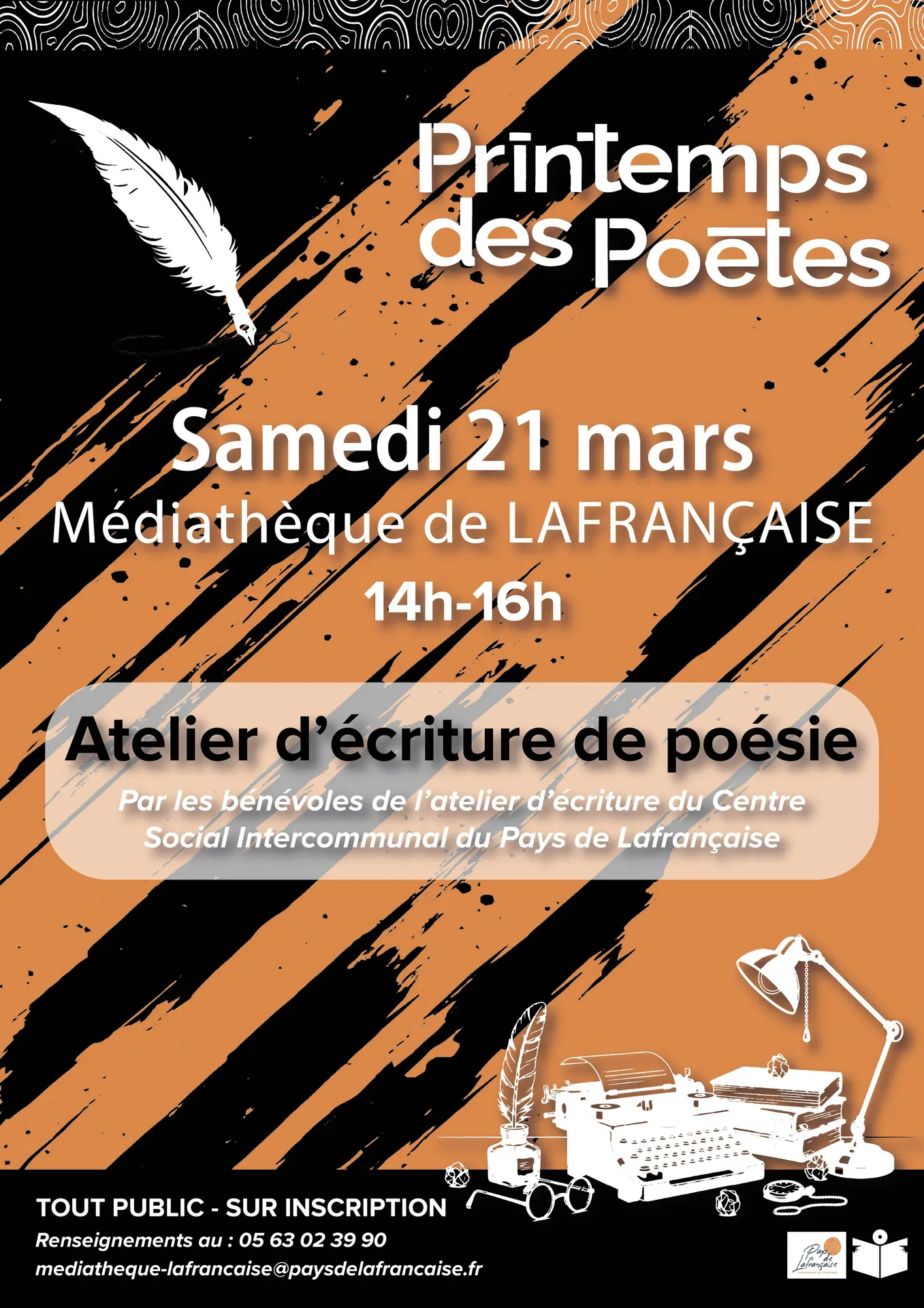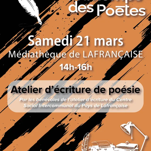 La Médiathèque de Lafrançaise vous invite à un atelier d’écriture de poésie à l’occasion du Printemps des Poètes. Venez laisser parler votre imagination, jouer avec les mots et partager un moment créatif et convivial !