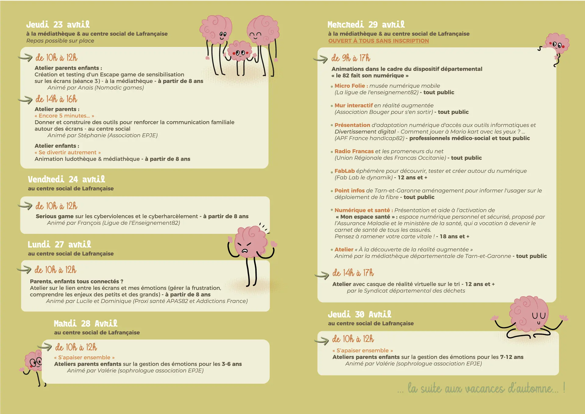 Les activités visent à sensibiliser, éduquer et divertir les familles sur des thèmes variés (écrans, numérique, gestion des émotions, etc.).