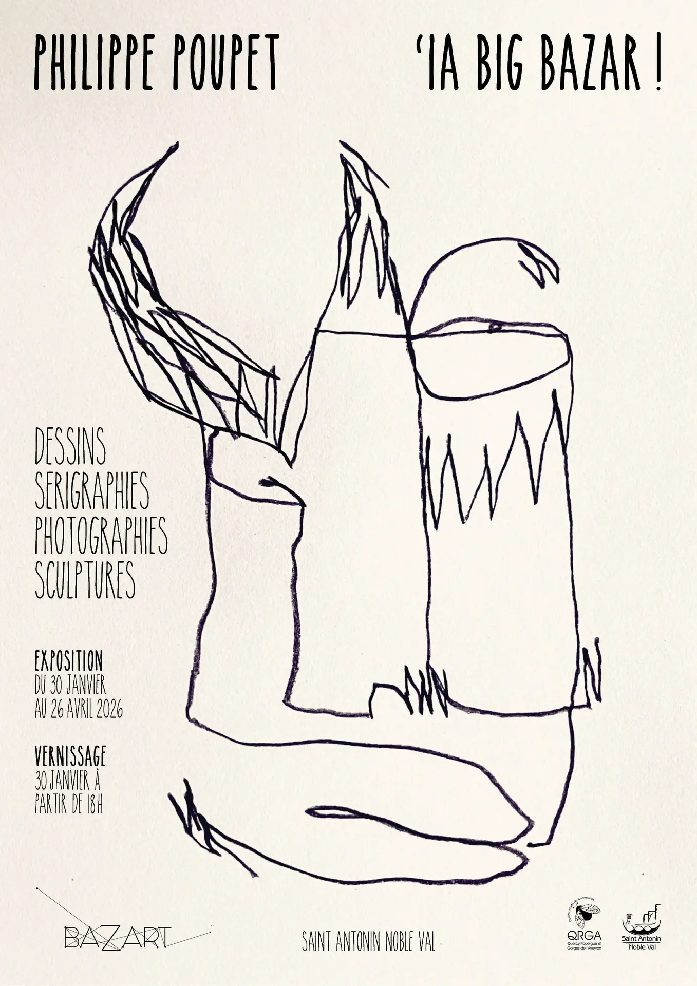 Pour son exposition à Bazart, l’artiste nous montre deux facettes de son travail. Un ensemble de dessins récents, pièces uniques et lithographies numérotées ornent les murs du café. À l’étage, une série de 7 photographies relatent un travail réalisé en 2023 dans le nord du Mexique aux paysages désertiques, où Poupet a abandonné des sculptures. Il part ainsi à la recherche d’un nouveau socle, d’une géographie qui soit à la fois matière et geste, capable de prolonger les intentions qui motivent sa pratique de sculpteur. On peut en juger en levant la tête vers la pièce qui couronne l’exposition : Parafond, une sculpture qui met en scène un moment peu montré dans l’art, tranquille ou menaçante, comme un nuage...